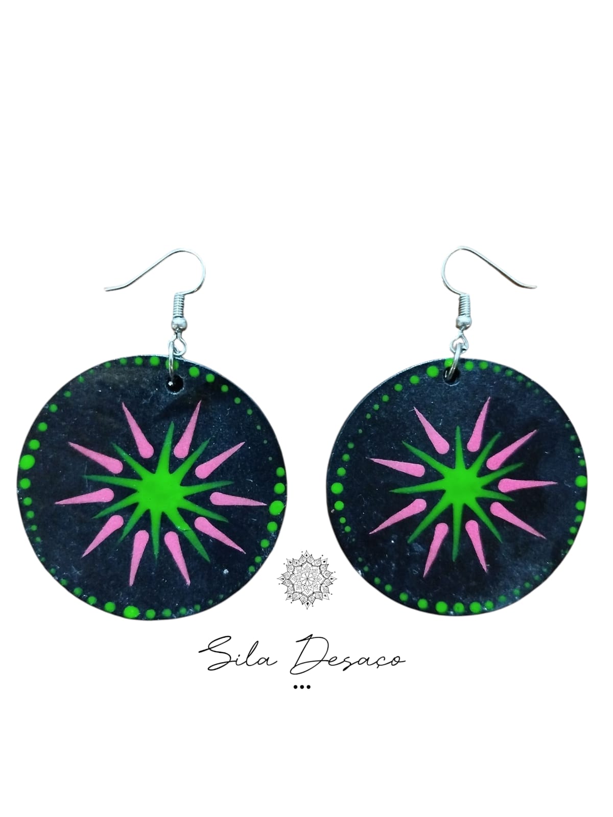 Descrição:Brinco fundo em preto com desenhos em rosa e verde