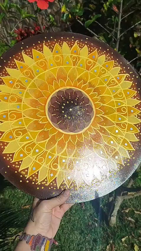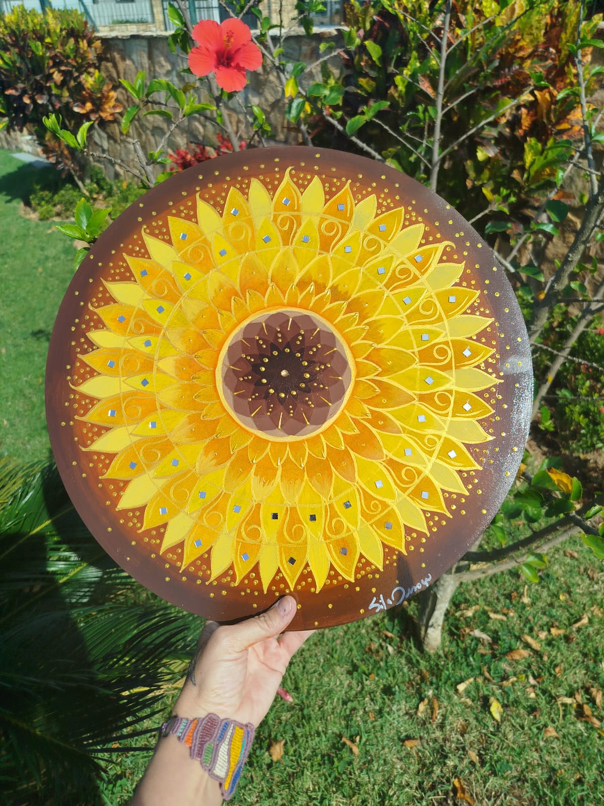 Descrição curta: Essa mandala simula um desenho de girassol, é pintada com pincel em diversos tons de amarelo e dourado