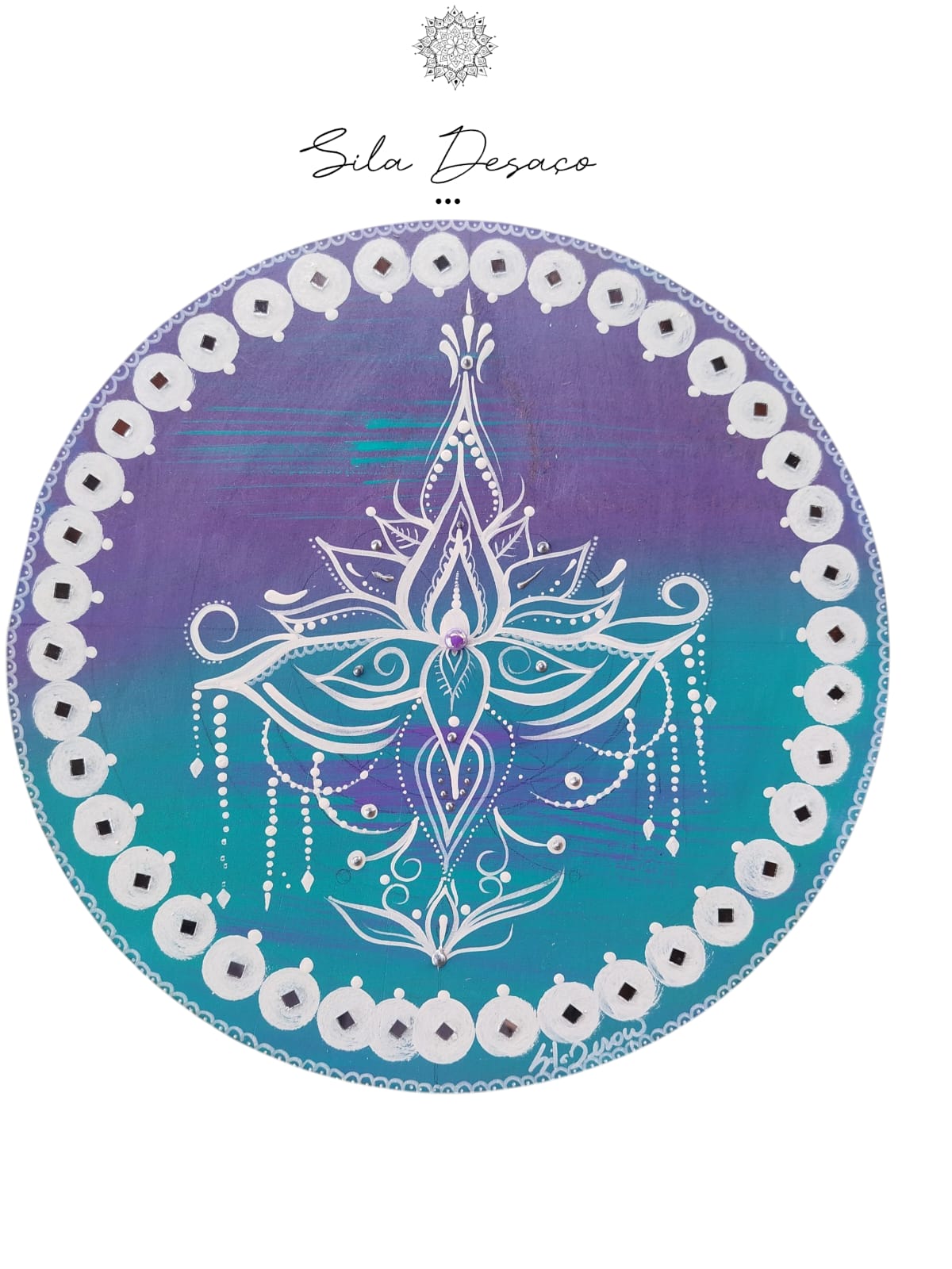 Essa mandala com desenho da flor de lótus, propõe reflexões sobre nosso passado, visando a ascensão espiritual em nossa trajetória, reconhecendo nossos caminhos e deixando florescer a beleza da superação